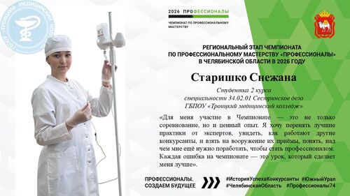 Студентка 3 курса специальности 34.02.01 Сестринское дело. За время обучения в колледже зарекомендовала себя как ответственная, добросовестная, исполнительная студентка. Эти личностные качества помогают Регине быть лидером в группе, старостой. В учебной деятельности проявляет максимальную настойчивость, и упорство в получении знаний, о чём свидетельствуют хорошие и отличные показатели успеваемости за время обучения. Регина активно принимает участие в работе Студенческого совета, имеет грамоты и благодарственные письма за отличную успеваемость и активное участие в жизни колледжа.